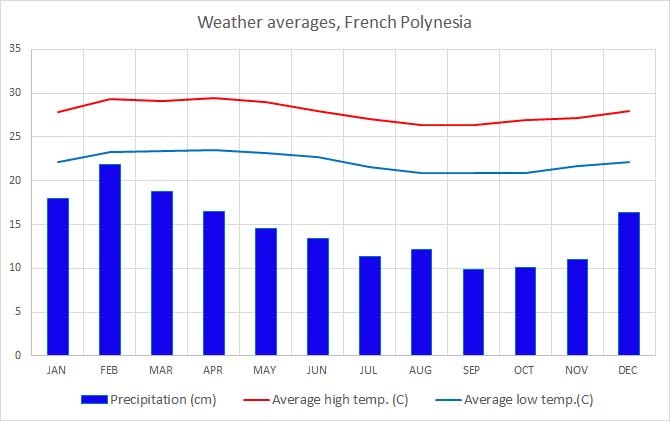 Temperatures are almost the same all year round, 24-30 degrees Centigrade. There is only a slight dip by 2 degrees during the southern winter, June through September. These are also the drier months. It can rain more in November through March. We have been to French Polynesia in April and June. Contrary to the averages, April was drier for us, but we cannot compare it with the statistically rainier period of December - February. It seems that April through October are the better months to visit South Pacific. You can check for more information here.
