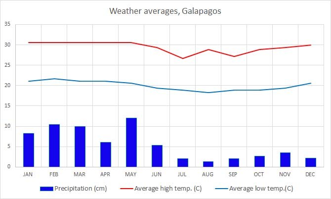 Winter is reverse to travelers from the Northern hemisphere. The islands are on the Equator, but the Humboldt current brings air and water from the Antarctic and this cools down air and, to a greater degree water. The warmest water is between February - April, but this is also the slightly more rainy period. There is also another current from the north which brings warm air and water to the northern islands such as Darwin and Wolf. If you are not a diver you can come at any time, but for divers colder months mean diving in a dry suit and possible rough sea. You can check for more information here.