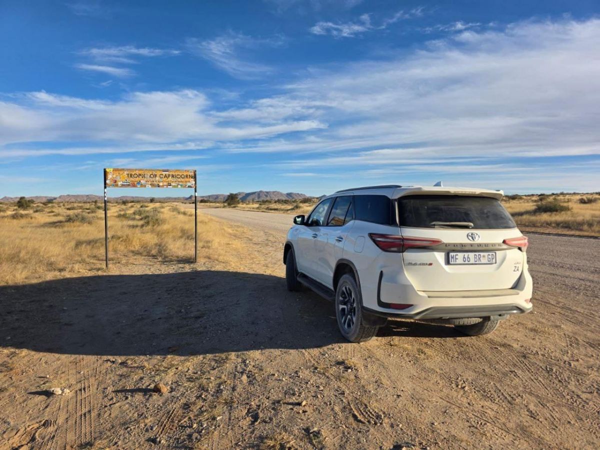 It takes about 5 hours to drive from Windhoek airport to Sossusovlei. The road is mostly gravel but we could do 90-110 km/h, depending on the "washboard" amplitude. You will cross the tropic on the way, watch for the sign.