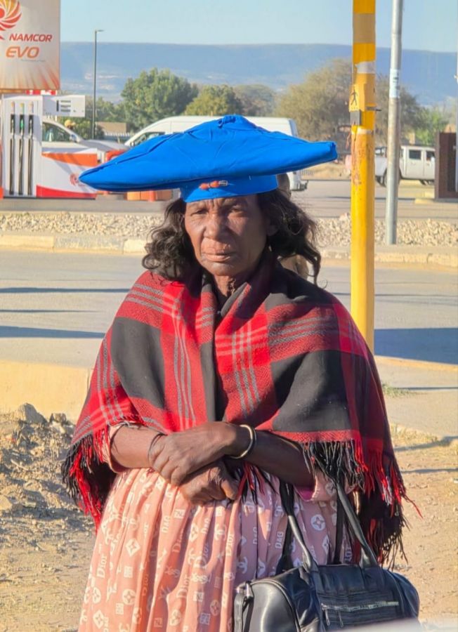 While driving through Opuwo we saw Himba women walking through the town in this traditional outfit, doing shopping and other errands. As morning tempreature can be quite low they add some modern dress components, mostly blankets and shawls.